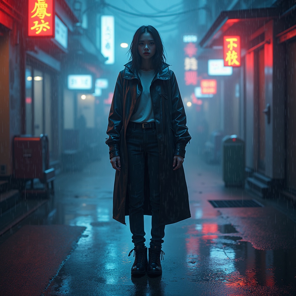 A wide angle full-length photo captures a young woman standing in the midst of a stormy rain. She wears a movie-inspired jacket coat that embodies futuristic sci-fi fashion, fitting perfectly within a cyberpunk neotokyo setting. The footwear is realistic yet seamlessly blends with a synthwave aesthetic. Bright low-emission neon lights illuminate the scene, reminiscent of a Bladerunner movie, highlighting her symmetrical eyes with dramatic lighting that adds depth and intrigue to her expression. The environment is rendered in ultra-high resolution, capturing the photorealism of an 8k hyperrealistic cgi photography. There’s a sense of both artistry and technology as the 3d render, enhanced by octane processes, showcases a world that feels both doll-like and authentic. The intricate details maintain clarity despite the weather, emphasizing the lifelike textures and shadows. All aspects harmonize to create a visually striking scene free of imperfections and distortions, bringing the imaginative world to life in a captivating, high-quality image.