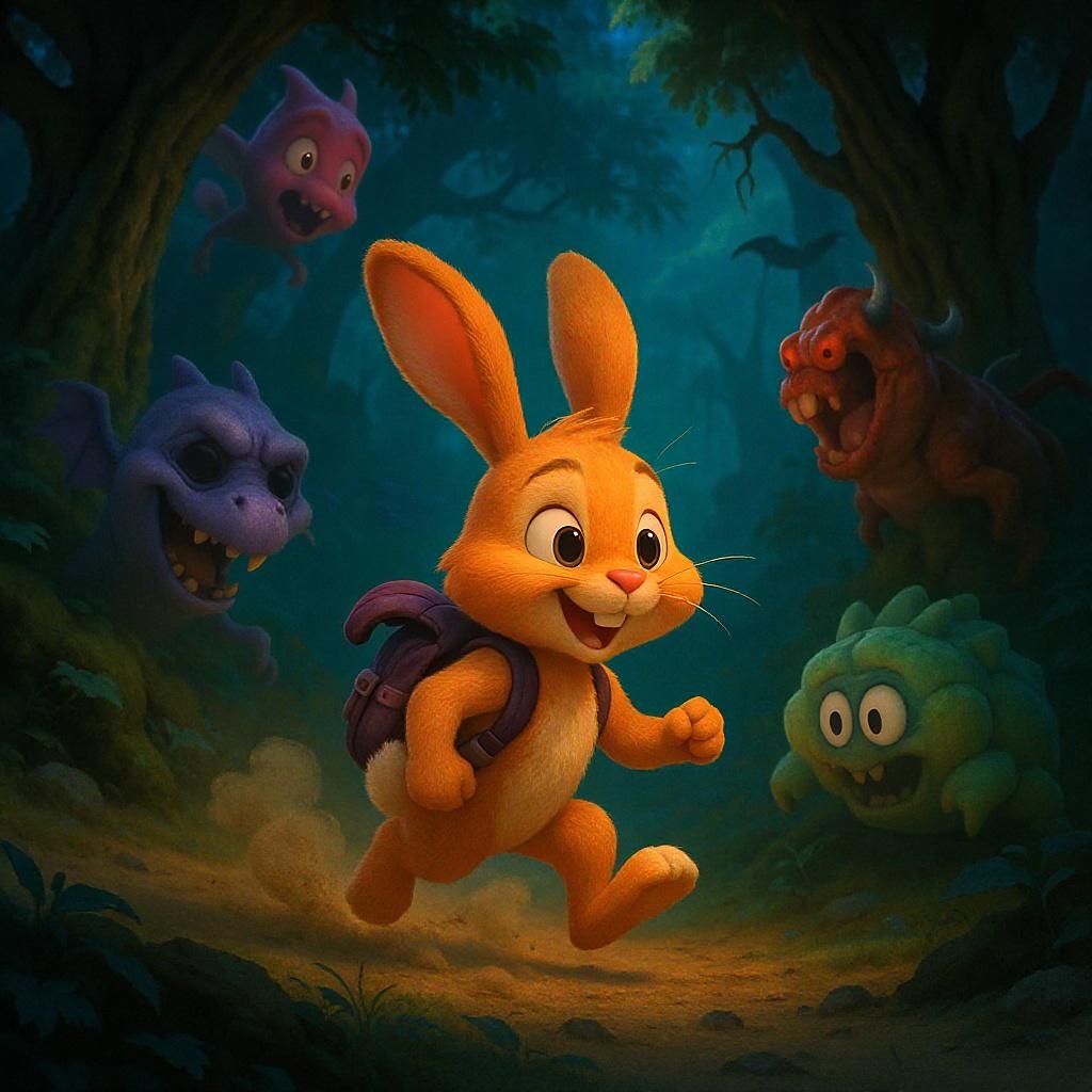 In a whimsical animated film, a bright orange bunny embarks on a thrilling adventure through a mysterious forest filled with quirky, humorous creatures and spine-chilling surprises.