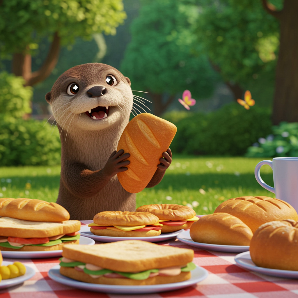 In a colorful, animated world reminiscent of a Pixar film, a mischievous and adorable otter, with twinkling eyes and a playful smile, stealthily approaches a picnic table set in a sunlit park. The air is filled with the scent of freshly baked bread, and the table is laden with an inviting spread of sandwiches, pastries, and fruit. With nimble paws and a heart full of adventure, the otter slyly swipes a warm, crusty loaf of bread, its expression a blend of triumph and cheekiness. The scene captures the whimsical charm of the otter's daring escapade against a backdrop of lush greenery and dappled sunlight, where colorful butterflies flutter and the laughter of picnicking families fills the air.