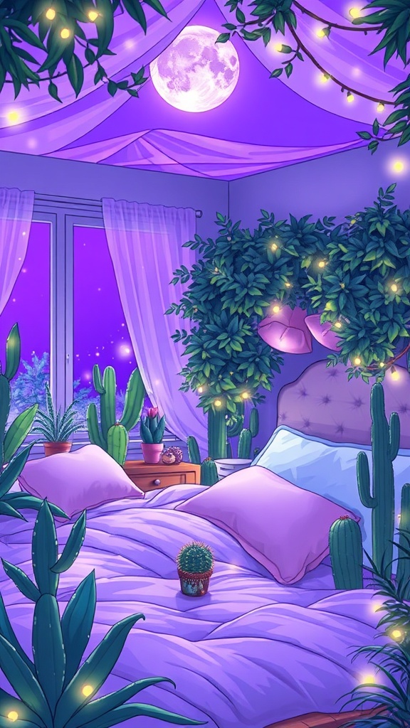 An enchanting anime-inspired bedroom, bathed in a soft wash of purple moonlight, filled with lush greenery and adorable cacti. The room is adorned with twinkling fairy lights that cast whimsical shadows, creating a serene nighttime retreat. Hints of pastel decor and plush pillows add to the cute and cozy ambiance, inviting relaxation and sweet dreams.