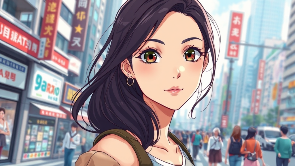 Anime-style illustration of a beautiful woman strolling through a bustling urban landscape, capturing her features in an extreme close-up, her expressive eyes reflecting the vibrant energy of the city around her, subtle artistic changes add a playful twist to her hair and attire while maintaining the dynamic essence of the scene.