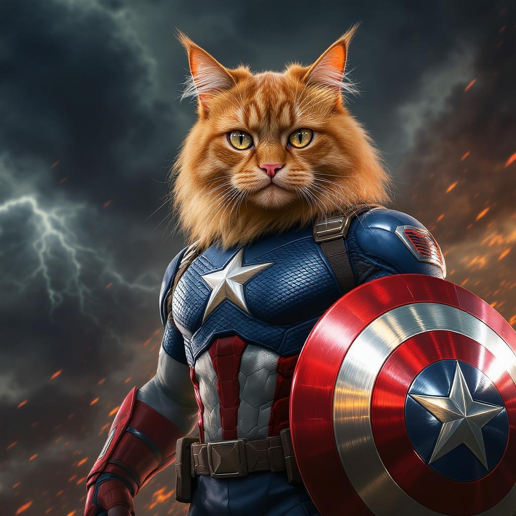 View this AI-generated image featuring anthropomorphic cat head on a heroic humanoid body vividly detailed movie poster style inspired by captain america with iconic shield ultra realistic octane rendering excluding human elements features a dynamic action pose in a dramatic background fur texture a