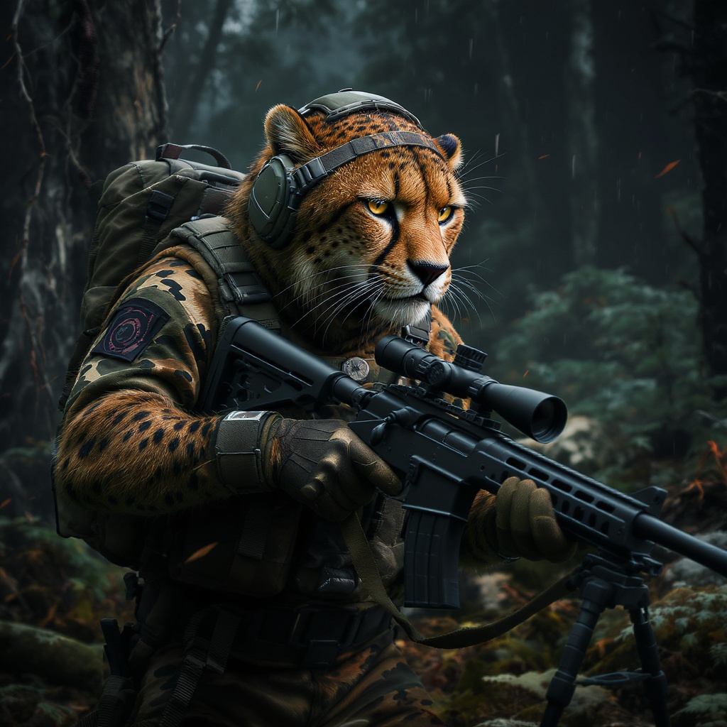 View this AI-generated image featuring anthropomorphic cheetah expertly disguised in advanced camouflage equipped with cutting edge sniper gear clutching a precision sniper rifle with keen focus depicted in super fine detail ultra high definition 8k resolution the scene captures maximum facial detai