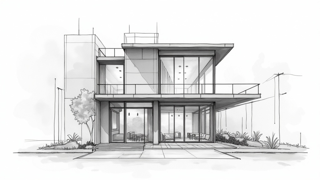 View this AI-generated image featuring architectural sketch of a two story contemporary cafe facade with a central composition inspired by bauhaus style and modernism the design showcases alignment lines and is simplified yet stunning the expression is intentionally rough set against a white canvas