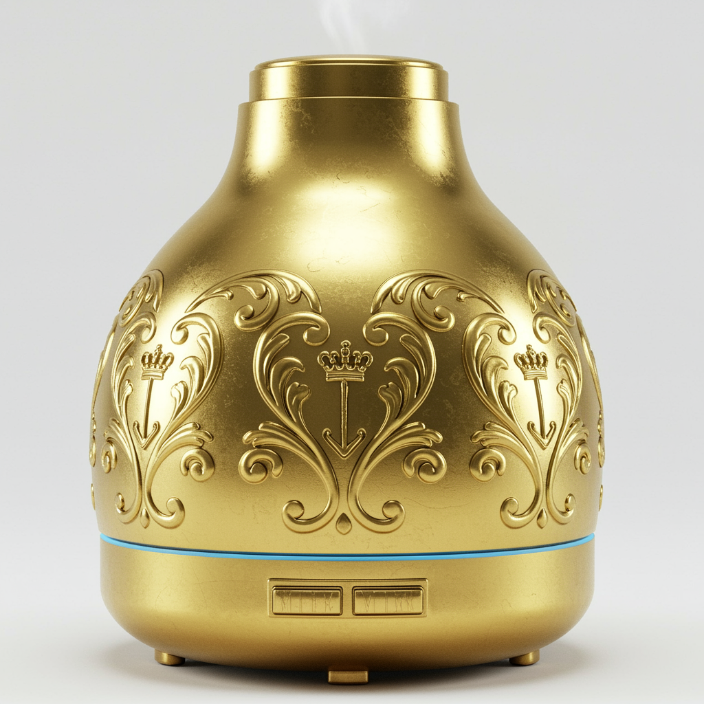 Aroma diffuser inspired by the majestic elegance and luxury of the Palace of Versailles, featuring a lustrous gold metallic exterior adorned with elaborate and refined floral engravings. The design is artistically rendered in the style of ArtStation, showcasing digital art that is hyper-detailed and hyper-realistic. The diffuser is set against a pristine white background, crafted with the precision of Unreal Engine in mind for maximum realism. The image is envisioned in a high-resolution PNG format 8K with an exquisite depth of field, aspect ratio 1:1. Equipped with subtle touches of royal emblems and a hint of soft, ambient lighting to emphasize the intricate craftsmanship and regal essence.