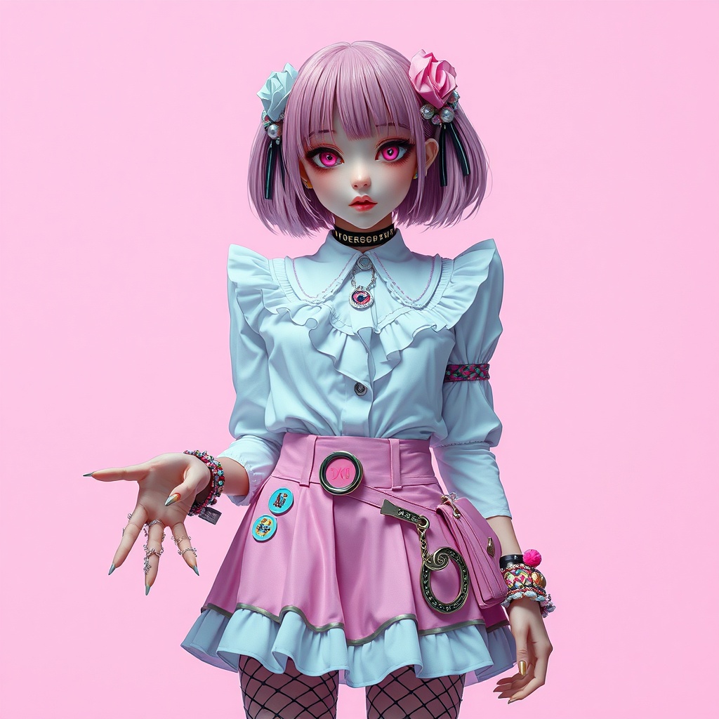 View this AI-generated image featuring art inspired by shintaro kago featuring a solo figure embodying the menhera and yamikawa punk spirit infused with jirai kei elements the character has a detailed face with striking pink eyes adorned in a white blouse with frills and a punky skirt complemented b