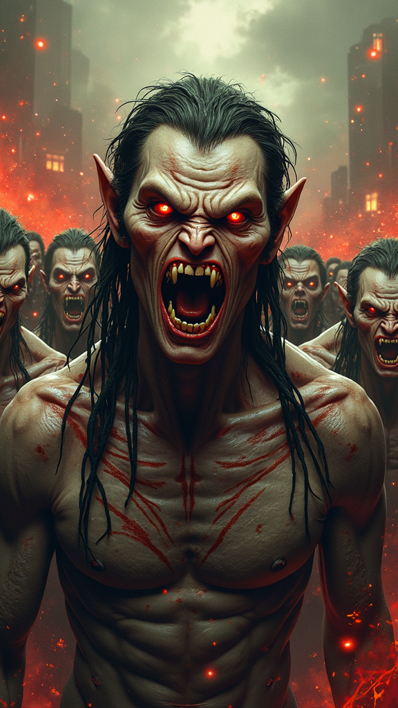 Art in the style of Jim Lee and Greg Rutkowski, depicting an angry human mutant with a focus on a highly detailed face and captivating eyes. The scene unfolds in a richly detailed environment filled with vibrant and extreme colors, professionally graded to emphasize mood. The atmosphere features edge lighting and elements of fire, suggesting a backdrop of chaos and mayhem. In the foreground, a group of people showcases multiple faces with signs of mutation and deformation, illustrating unsettling anatomy and proportions. Features include extra limbs, fused fingers, and elongated necks, blending the grotesque with the fantastic. Amongst the crowd, disfigured faces and duplicated bodies add to the surreal and chaotic scene, with missing limbs and malformed extremities creating a vivid portrayal of mutation and transformation.