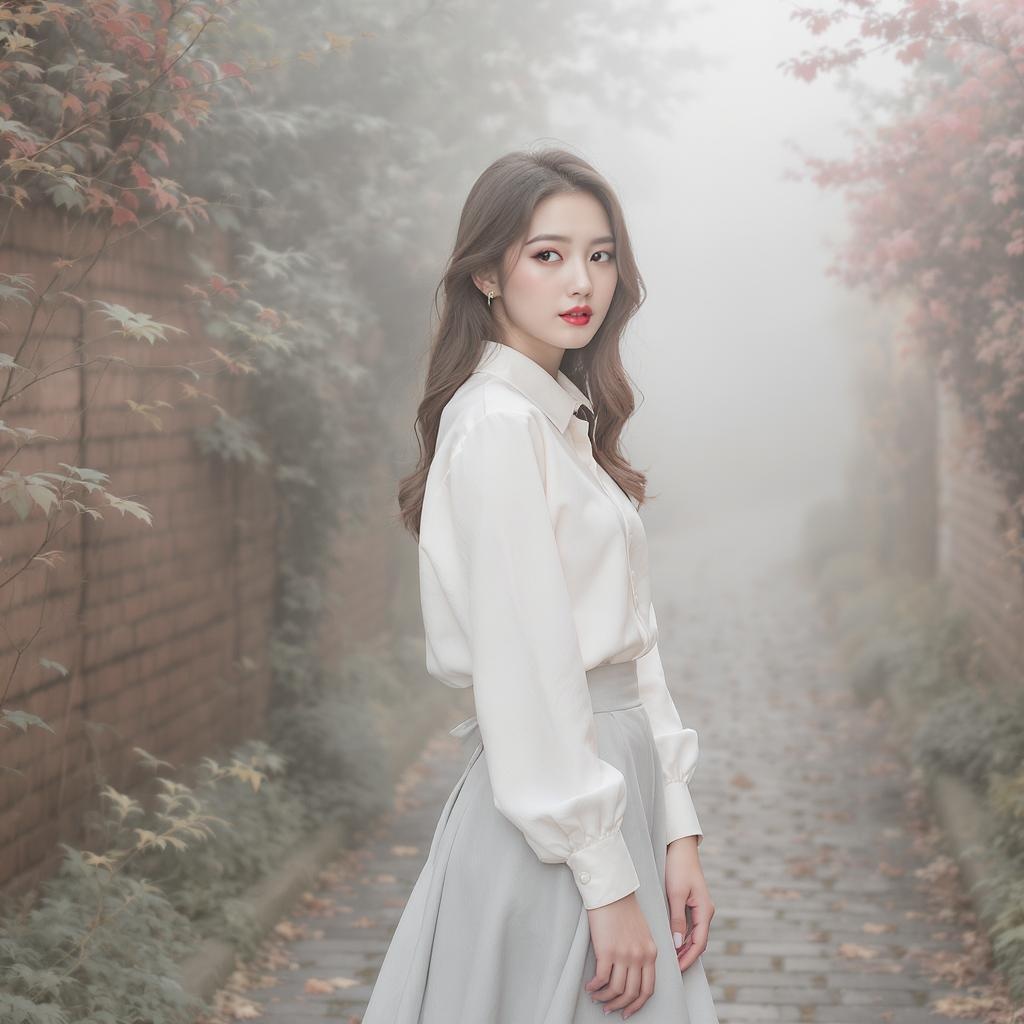 A fine art photograph of a strikingly beautiful woman in her early twenties, defined by refined features and an air of elegance, enveloped in a gentle misty atmosphere. The scene unfolds in soft pastel hues, with a touch of modernist charm. The visibility is moderate, creating a serene, soothing ambiance with a delicate contrast, capturing the grace and allure of professional artistry.