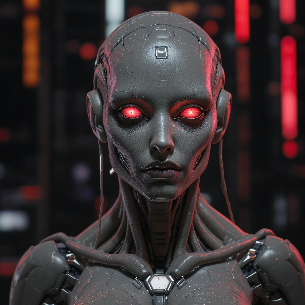 Artificial intelligence female face android, ultra-high detail graphics, cinematic illumination, vivid 4k resolution, artstation quality, hyperrealistic with intricate detailing, empowered presence, accentuated by rim lighting and diffraction grading, utilizing advanced RTX rendering, inspired by Ivan Shishkin; altered low-resolution appearance with text elements and digital compression artifacts. The scene is purposefully cropped, capturing imperfections like duplication, morbid or unsettling features, mutations, and distortions; featuring elements slightly out of focus, dehydrated look, disproportionate anatomy, extra or fused limbs and distorted facial structure, emphasizing experimental and abstract artistry.