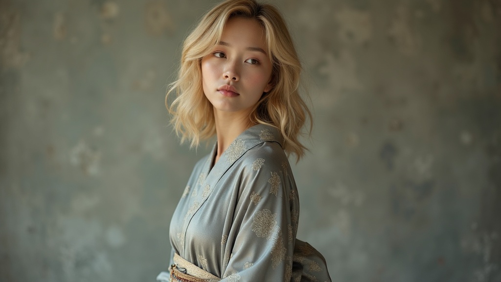 A young Asian woman with shoulder-length, golden blonde hair, dressed in a traditional grey silk kimono adorned with subtle floral patterns, stands gracefully, her expression serene and contemplative.