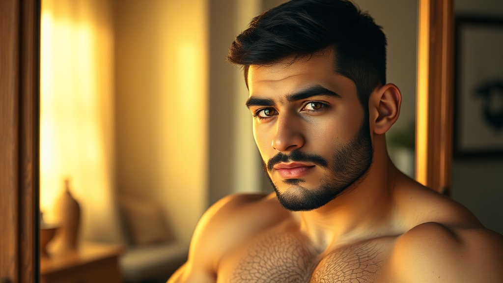 A 20-year-old, athletic, Persian Iranian wrestler with an impressive build stands confidently in front of a mirror, his handsome features accentuated by a well-groomed mustache. A hyper-realistic image captures him with strikingly perfect eyes and vivid pupils that bring out his charismatic presence. His short, dark hair complements the robust and flawless physique that displays perfect human anatomy. Photographed with an iPhone 14 in a bright, cozy room, the scene is enveloped in the warm tones of the golden hour. A subtle film grain effect reminiscent of Kodak Portra 800 film adds a nostalgic yet modern touch, while the f/1.8 aperture ensures a rich depth of field, creating an image that captures both the subject's realism and the inviting ambiance of the setting.