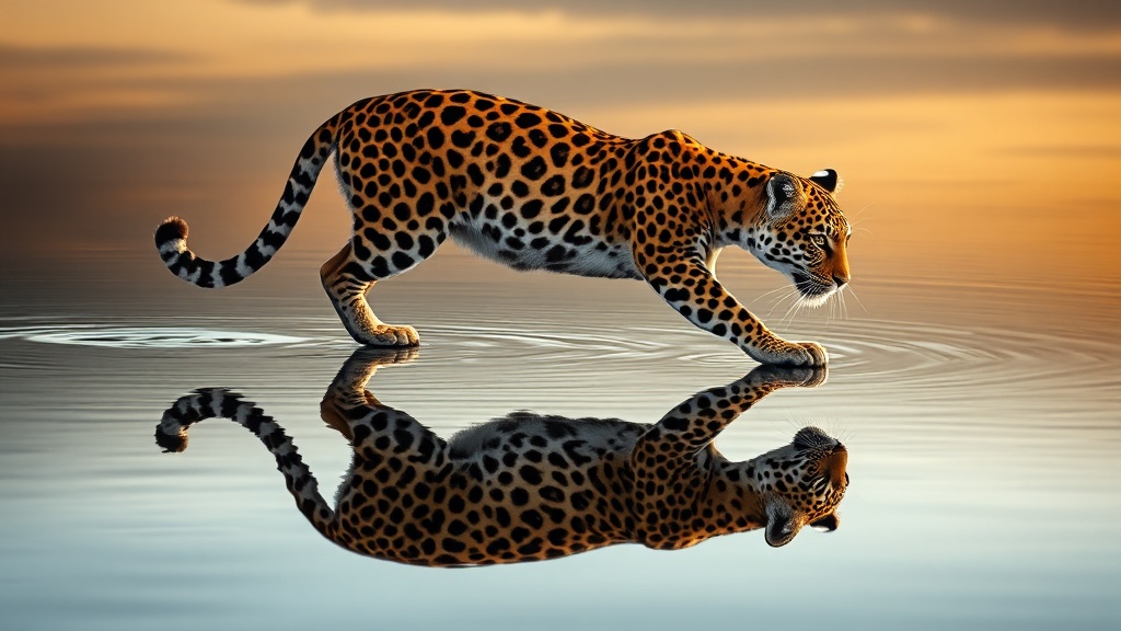 Award-winning portrait of a jaguar gracefully striding across a reflective water surface, its gaze fixed on its own mirrored image; cinematic backlighting accentuates the refined contours of the scene, while the golden ratio informs the perfect composition, exuding elegance. The ultra-high-resolution image captures every minute detail in sharp focus, embodying a masterpiece of photographic artistry with HDR depth.