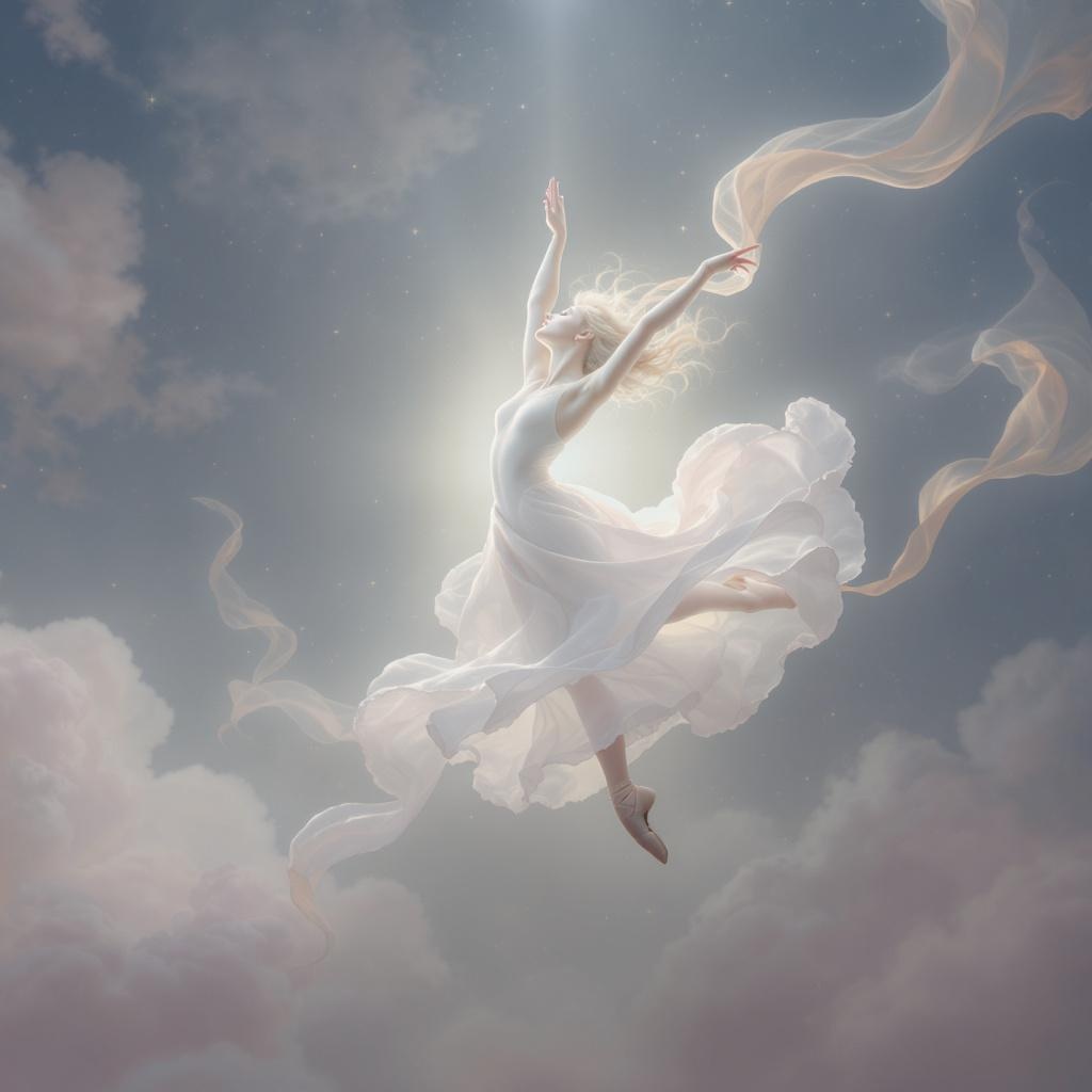 View this AI-generated image featuring in a whimsical ballet of graceful motion the celestial elegance is encapsulated in this portrait of a dancer suspended in midair gentle pastel hues radiant backlighting and wispy fabric craft an otherworldly atmosphere the scene is enhanced by dramatic lighting