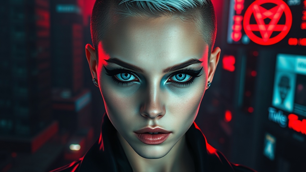 Beautiful cyberpunk female with pale skin, striking blue eyes, and a shaved side haircut. Her look is accentuated by heavy black eyeliner. The scene is set with hyper-detailed and cinematic lighting, enhanced by magic neon hues against a dark red cityscape. A touch of mystery is added with the presence of an Illuminati symbol subtly integrated into the background. The aesthetic captures the essence of cyberpunk with intentional imperfections like a low-resolution finish, jpeg artifacts, and text snippets that seem out of place. Her figure is portrayed with minor anatomical inconsistencies like missing fingers or extra digits, adding an eerie, almost mutated quality. The composition suggests a cropped, slightly distorted view that blends surrealism with digital decay. This vision balances beauty with flawed art, creating a unique and compelling image.