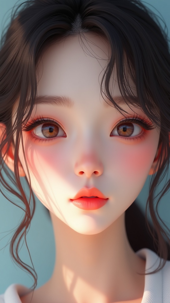 Beautiful Korean woman, K-pop idol, symmetrical eyes, ultra high resolution, photorealistic, 8k, hyperrealism, dramatic lighting, professional photography, CGI, 3D model, doll-like features, octane render, cartoon influence, anime style, illustration, digital art, digital painting, attention to detail, vibrant colors, aesthetic appeal, clarity, expression, elegance, grace, creativity, unique style, coherent anatomy, balanced proportions, well-defined features.