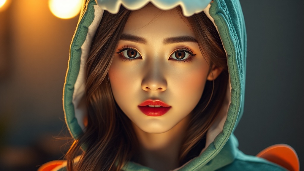 Beautiful Korean woman, resembling a kpop idol, dressed in an adorable dinosaur costume, immaculate symmetrical eyes, rendered in ultra high-resolution, capturing photorealistic detail in 8k with a touch of hyperrealism. The scene is illuminated with dramatic lighting, emphasizing her features, complemented by soft red lipstick for an elegant contrast, creating an enchanting photography experience.