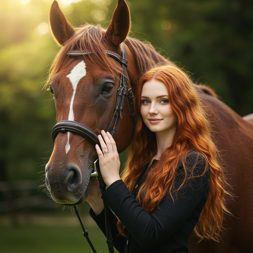 A stunningly beautiful young woman, appearing to be 22 years old, with flowing long auburn hair that cascades in gentle waves, standing gracefully beside a majestic horse. Her hand softly cradles the horse's muzzle, her warm smile conveying a sense of harmony and connection. The sunlight filters through the trees, casting a serene glow on her delicate features and enhancing the vibrant colors of her hair and the lush scenery surrounding them.