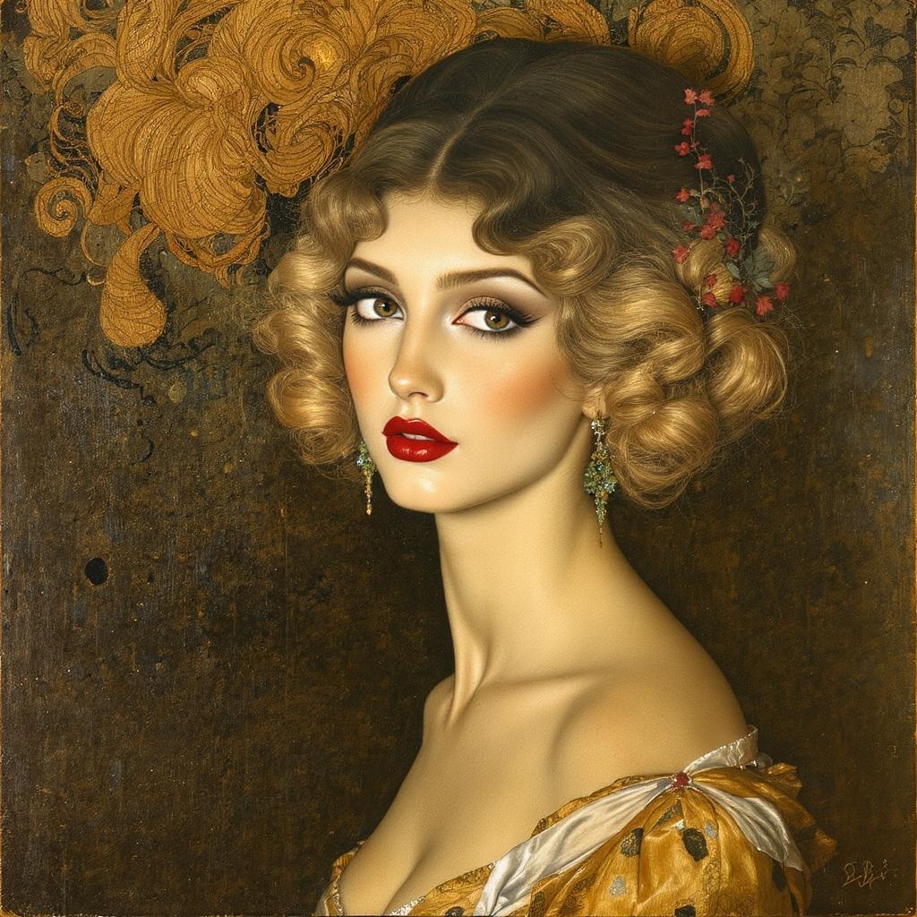 Before you stands the ultimate embodiment of beauty, a vision of ethereal grace. Her cheekbones are elegantly sculpted, her jawline refined, and her lips full and inviting, each feature in perfect harmony. Her captivating eyes, enhanced by thick, dark lashes, exude a mysterious, enchanting allure. Her hair cascades in luxurious waves, catching the light with a silken glow. Created with exceptional attention to detail by the celebrated Gustav Klimt, this art nouveau creation is a mesmerizing wonder.