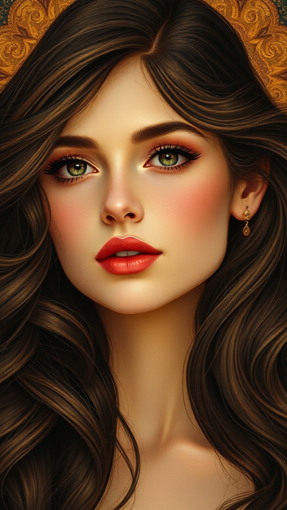 Before you stands an enchanting woman, her beauty transcending time. Her elegantly sculpted cheekbones and refined jawline complement her full, captivating lips. Her eyes, deep and alluring, sparkle under the shadow of soft, thick lashes. Her hair flows in rich, cascading waves that catch the light, adding to her radiant presence. As though painted by a modern-day Gustav Klimt, she embodies an art nouveau vision—a harmonious blend of grace and allure. Her essence conveys a captivating masterpiece of timeless beauty and artistic mastery.