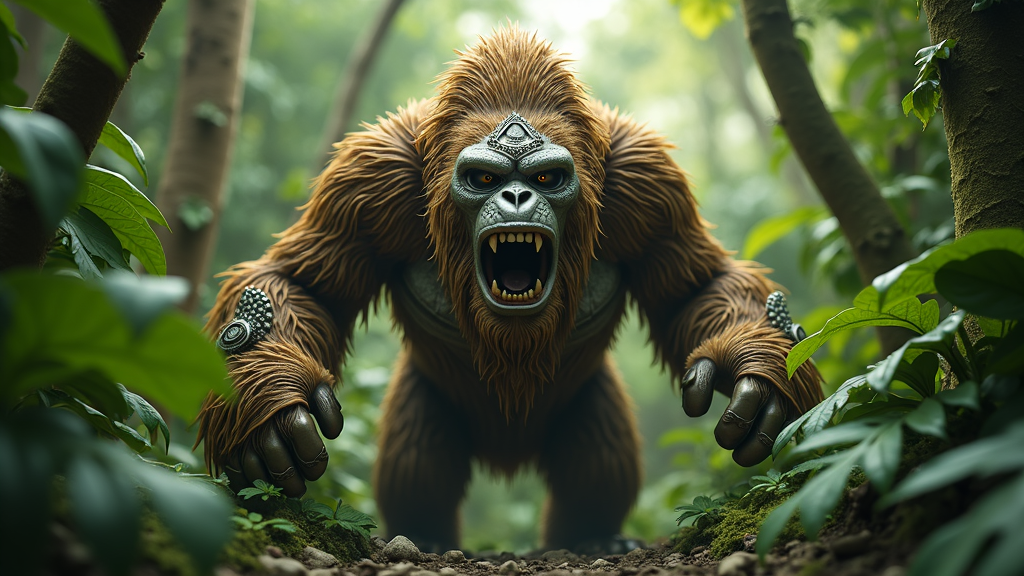 Bigfoot with silver eyes and golden hair emerges from the lush jungle once inhabited by ancient Mayan tribes, its growl echoing through the verdant landscape. The creature is adorned with exquisite decorative elements and rich ornamental patterns, each piece crafted with remarkable sophistication. Its presence is captured in realistic 3D micro details, offering a close-up view of its intricately textured fur and the glint of its eyes that seem to hold the secrets of ages past. The scene embodies an aura of mystique and grandeur, weaving together mythical allure and historical resonance.