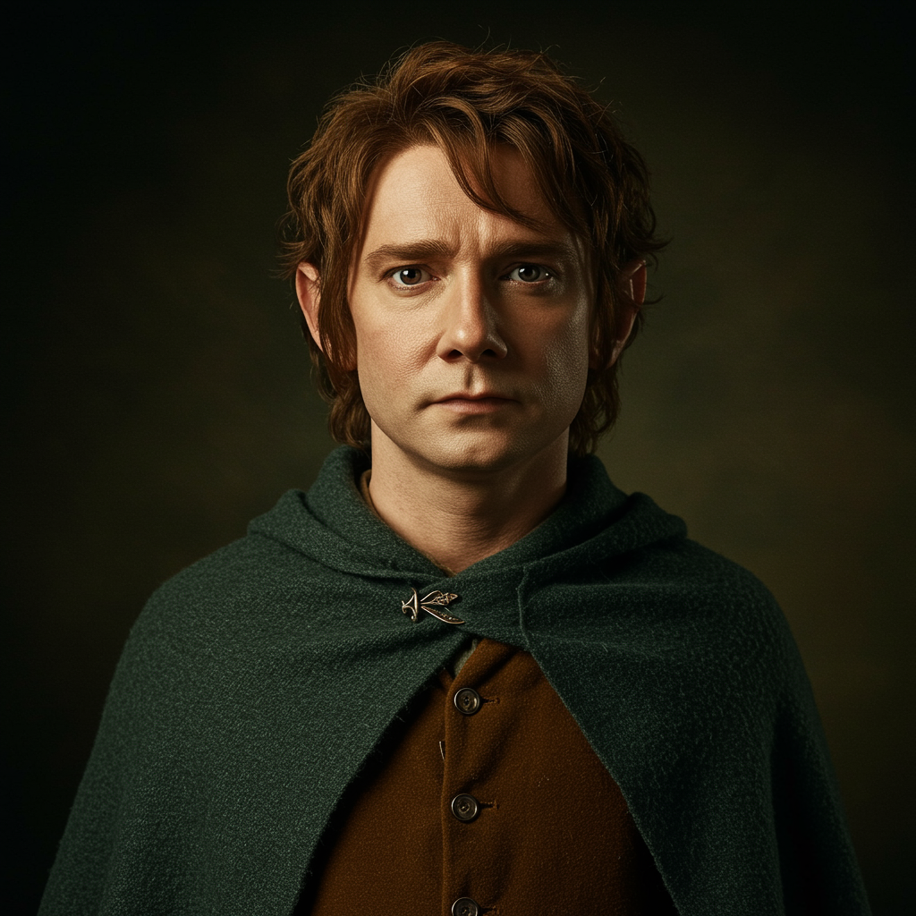 Bilbo :: The Shire Tales, J.R.R. Tolkien, ultra-wide angle, hyper-realistic, studio illumination, captured with Phase One, ISO 100, 4K resolution, in the style of Frida Kahlo, photograph by Annie Leibovitz, --ar 2:3 --q 2 --v 5 --s 750.