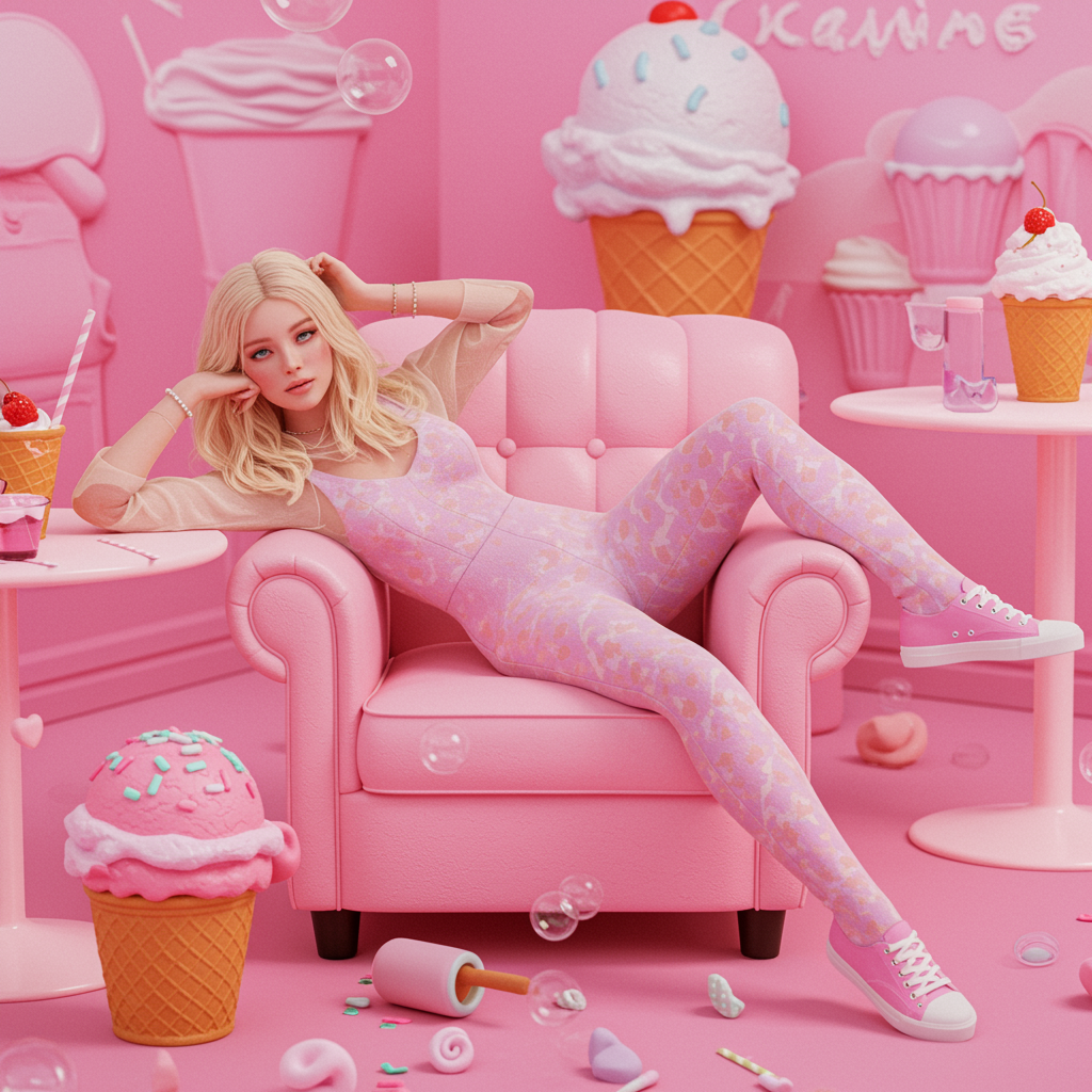 View this AI-generated image featuring blonde woman lounging on a pastel pink armchair in a whimsical ice cream parlor reminiscent of sydney sweeney official artwork evoking the essence of kim petras album cover design inspired by mike winkelmann art style by galen dara surrealistic approach bubbleg