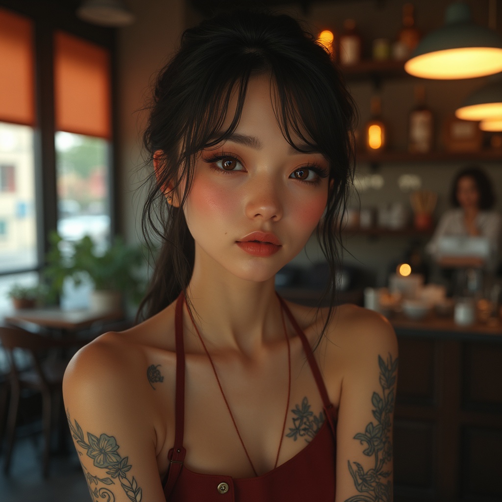 View this AI-generated image featuring a full body portrait of an extraordinary barista girl accentuating her striking eyes with detailed symmetry and reflective depth she expertly serves coffee in a cozy cafe with modern interior design her face highlighted by mascara and makeup features prominent
