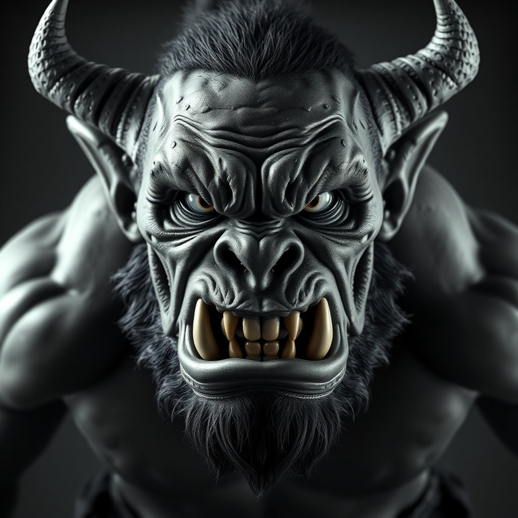 Body portrait of a very furious orc chieftain, exuding intimidation and menace with a powerful presence captured from a low angle. The portrait evokes a sense of horror, with an intense focus and smooth textures achieved through octane rendering. The orc's symmetrical face is rendered with exquisite detail in a masterpiece style, trending on platforms like ArtStation. The image is in 4k HDR with 35mm photography precision, inspired by the art of Stanley Lau, Jason Chan, and Mark Hill. The orc wears centered blue jeans, portrayed in a 3D render reminiscent of a plastic doll with an added blur and haze effect. Presented in monochrome black and white, the eyes appear unclear and mysterious. The image captures an otherworldly feel with a touch of surrealism, avoiding perfect anatomy and embracing subtle creative distortions. Despite the imperfect symmetry of the eyes, the orc's stance is one of fierce vitality, free of excessive limbs or malformed features, crafting a compelling visual narrative of raw, primal leadership.