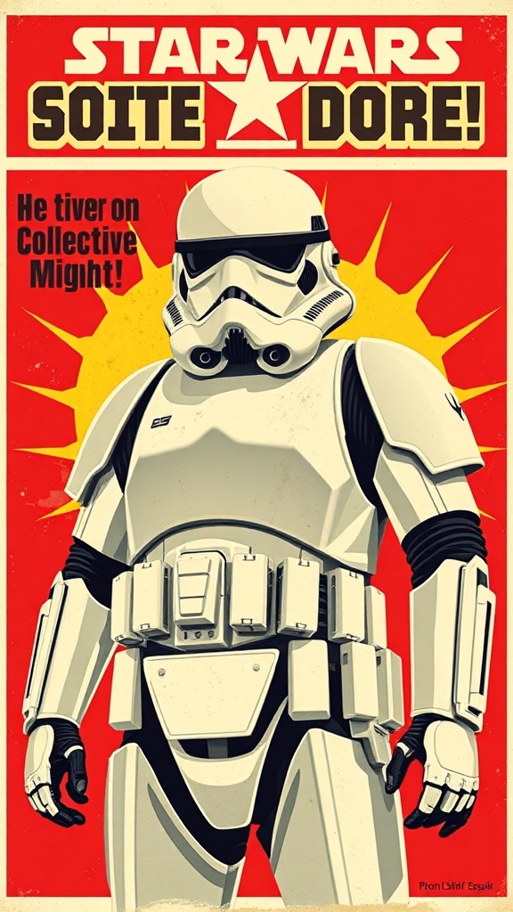 A Stormtrooper boldly depicted in a Soviet Union-inspired propaganda recruitment poster, featuring vivid colors and striking design elements. Standing proud in full armor, the figure symbolizes unity and strength, with inspirational slogans promoting collective might. Retro style and iconic imagery combine to deliver a powerful, thought-provoking message that is visually compelling.