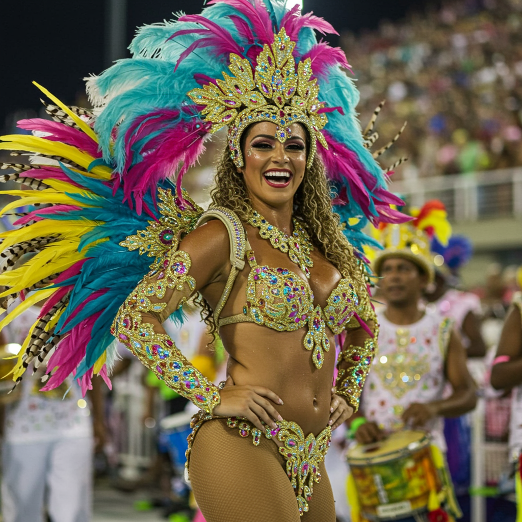 A radiant Brazilian woman adorned in a vibrant carnival costume, her ensemble dazzling with an array of bright feathers and shimmering sequins. Her presence exudes an infectious joy and dynamic energy, captivating all around. Her lively expression and graceful movements enhance the festive aura. The scene captures her in mid-celebration, surrounded by the enthusiastic rhythms and vivid colors of the carnival, reflecting a sense of cultural pride and sheer happiness.