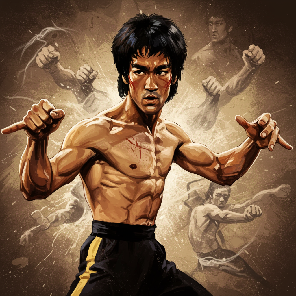 Bruce Lee in a storm of fists, his movements a blur of power and precision, hands painted in dynamic motion, set against a backdrop of swirling energy and intensity, aspect ratio 2:3, version 4.