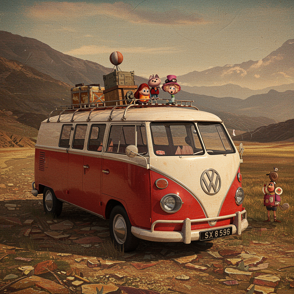 VW bus scene with hints of rustic charm, a blend of abstract and canvas art style reminiscent of Brian Mashburn's detailed landscapes. Light red and brown hues gently merge, evoking a nostalgic feel. Inspired by Theo Prins, charming characters add a whimsical touch, while Pierre Pellegrini's influence brings a timeless quality. Embrace a vintage cut-and-paste aesthetic, with elements of rusty debris subtly incorporated, creating a harmonious fusion of old-world charm and modern artistry.