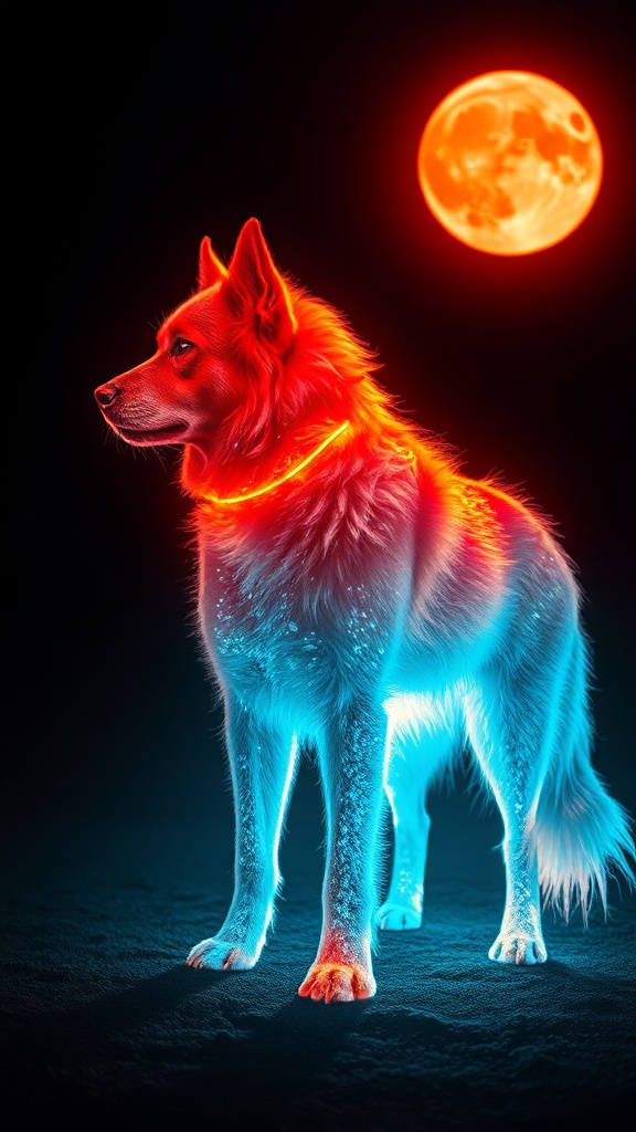 View this AI-generated image featuring a glowing canine silhouetted against the night its fur shimmering under moonlit hues casting ethereal shadows in neon hues. Created using advanced AI technology, this image showcases creative visuals, AI artwork. Perfect for creative projects, digital art, insp