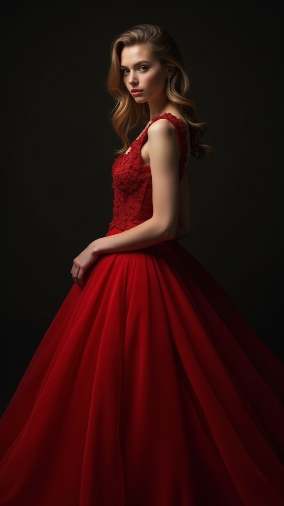View this AI-generated image featuring captivating eastern european model in a striking crimson gown intense and contemplative expression hyper realistic supreme detail high fashion allure professional studio lighting captured with cutting edge technology large format film equivalent ultra high reso