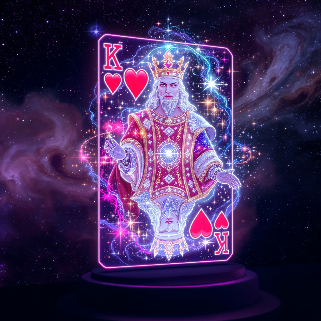The King of Hearts card metamorphoses into a 3D hologram, brimming with cosmic energy. As the regal figure arises, a cascade of stars and galaxies whirls around him, evoking a sensation of voyaging across the cosmos. His attire is embellished with intricate celestial motifs, and his crown is an effervescent cluster of twinkling stars. The hologram hovers before you, with the background seamlessly transitioning through various cosmic landscapes, from ethereal nebulae to enigmatic black holes. This visual marvel is ideal for space-themed gatherings, science fiction festivals, or cutting-edge technology showcases.