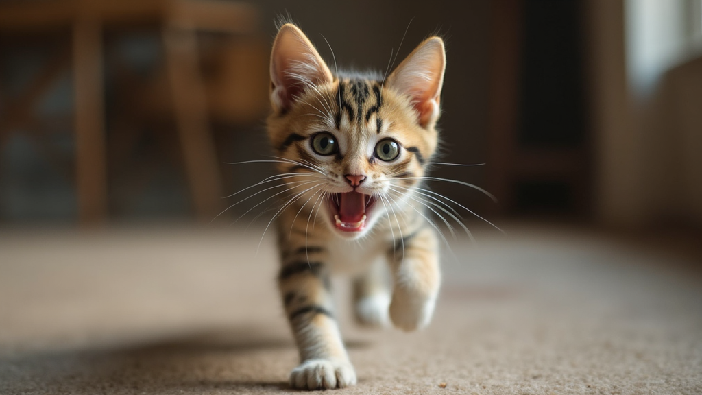 A playful cat pranced around, eyes wide with mischief, as it leaped and bounded across the room, its whiskers twitching in delight and a hint of mystery in its gaze.