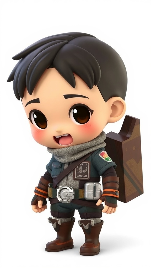 View this AI-generated image featuring chibi bertolt hoover from attack on titan in a full body pose designed in a cute and adorable style reminiscent of disney pixar characters featuring isometric 3d graphics suitable for a mobile game the character sports a hyper realistic texture with cinema styl