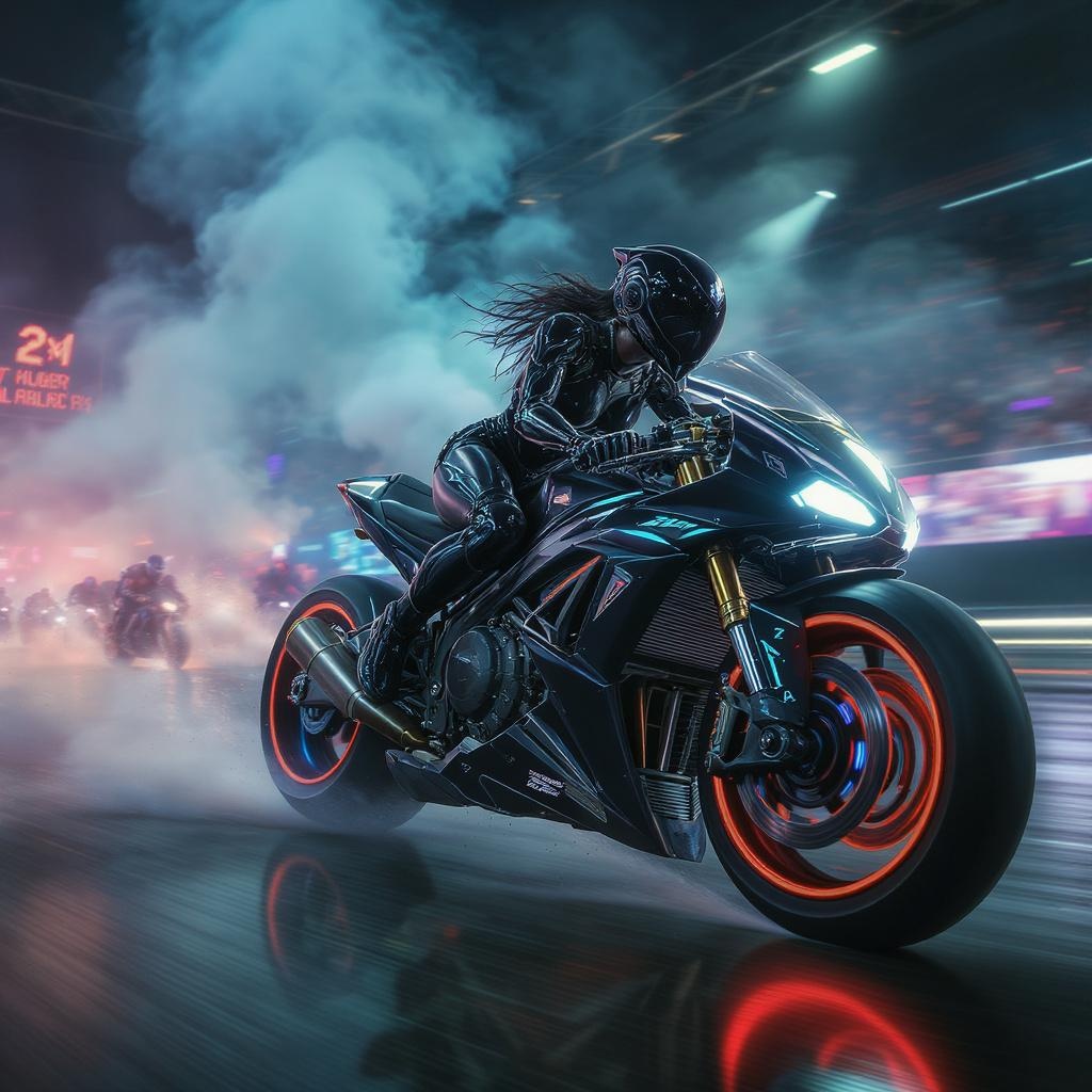 View this AI-generated image featuring cinematic ultra wide still raw photo of cyber enhanced biker zzz racing her battle bike she dons a black skin tight latex suit with intricate implants leaning forward as she pilots a sleek futuristic battle bike participating in a kinetic race within a smoky ar