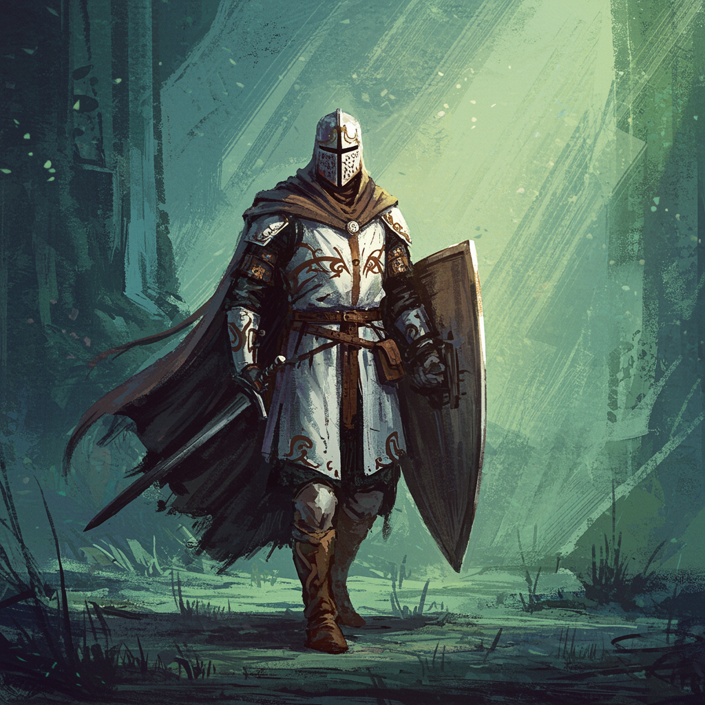 A knight with a shield and flowing cloak, rendered in the adventurous and gritty style of classic pulp illustrations. The knight's armor and shield are depicted in a dark white and mottled bronze, influenced by the intricate patterns of Yup'ik art. The scene is textured with the distinct strokes of palette knives, creating a dynamic interaction of light indigo and green hues. The composition is elongated, evoking a sense of grandeur and stature, reminiscent of artworks from 1970 to the present. The atmosphere is further intensified with a touch of mystery and stylized flair, giving the knight an aura of timeless heroism.