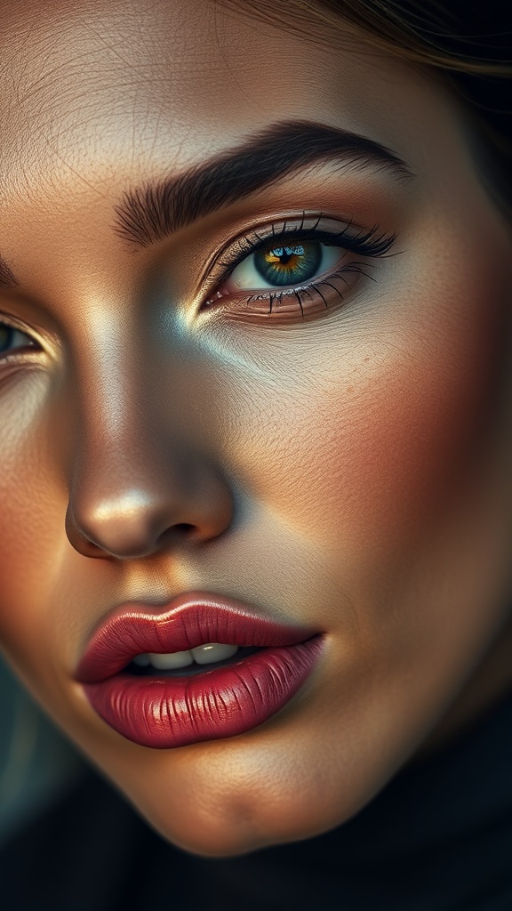 View this AI-generated image featuring close up of a breathtaking fashion model hyper realistic portrait captured on a sony a7r iv exceptional detail striking expression captivating gaze studio lighting vibrant colors immaculate makeup silky smooth skin sharp focus high resolution elegance personifi