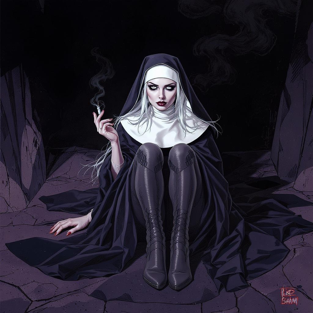View this AI-generated image featuring a dynamic comic book cover illustration features a white haired nun with an air of mystery exuding cool confidence as she sits with her knees drawn up casually smoking her expression reveals a hint of apathy the angle from above enhances her enigmatic presence