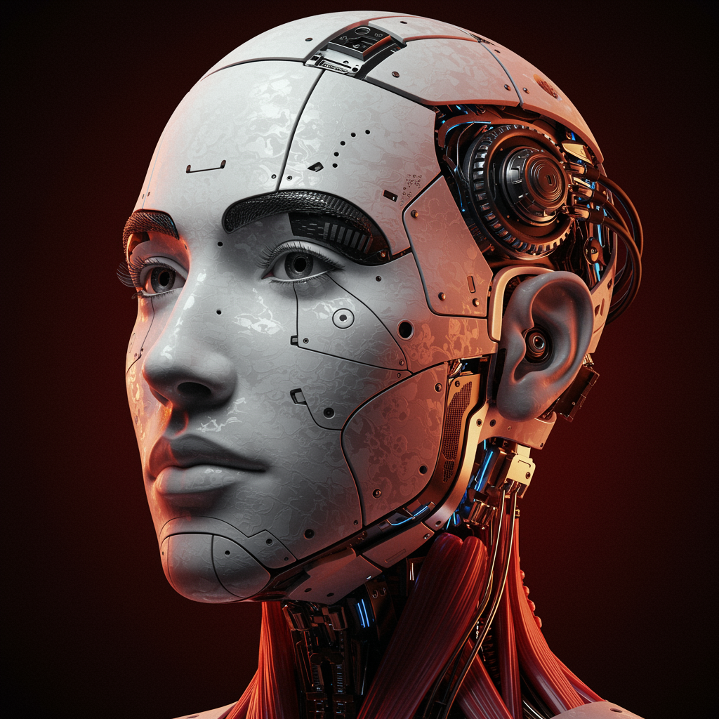 View this AI-generated image featuring complex 3d render of a highly detailed porcelain profile of a male android face featuring a blend of human and robotic elements with intricate cyborg details the composition includes robotic components anatomical elements and vibrant touches set in a luxurious