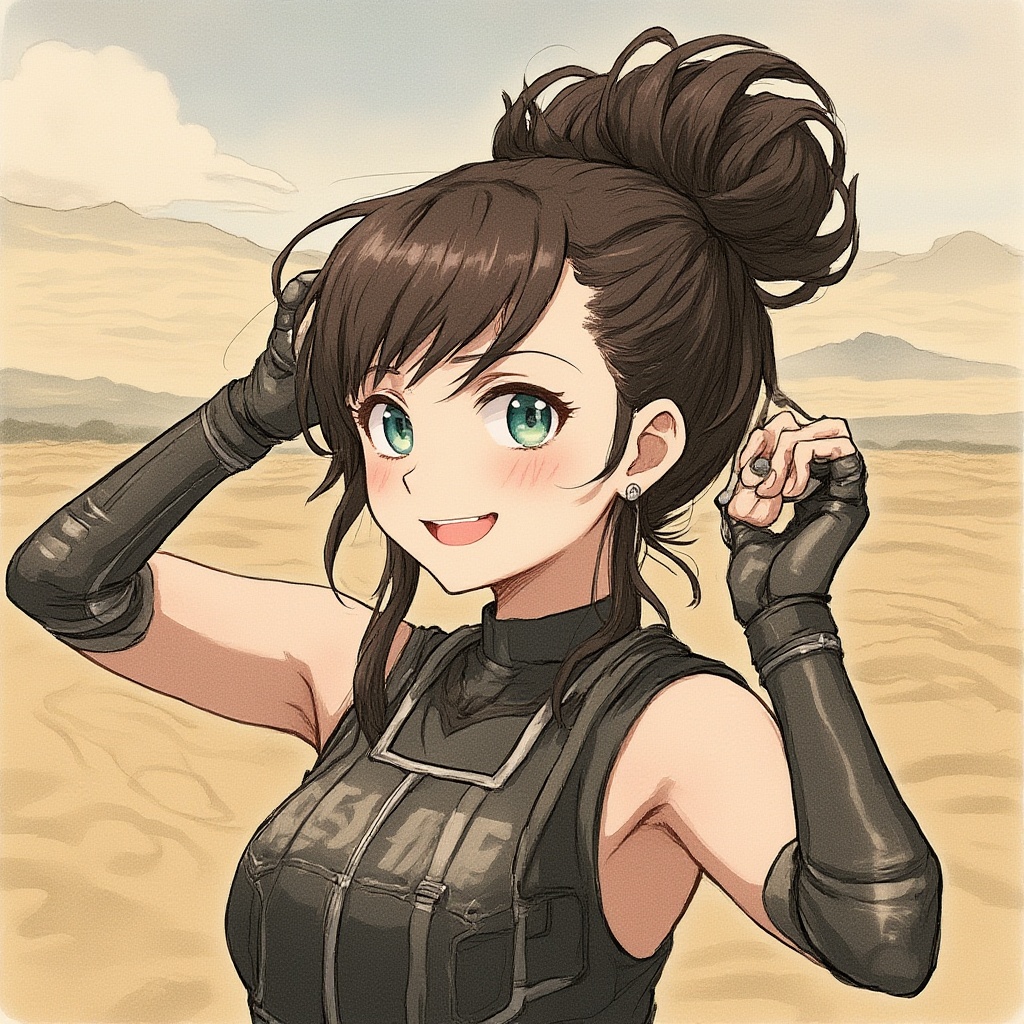 Create an anime full-body Symbolist ink wash painting of a 24-year-old Yao-Greek female edgy rocker girl with a warm, inviting expression. Her supple, hydrated skin appears plump and bounces back to the touch. She wears subtle makeup with a hint of blush on her cheeks and a natural pink shade on her lips. Her eyes are an inverted triangle shape, with calm, muted green hues, framed by long, elegant eyelashes. Her hair is styled in a braided bun, and her eyebrows are neatly shaped, complementing her delicate facial features. Her body showcases strong, muscular arms with lean, defined lines, a small breast, and toned abs. She has cybernetic enhancements and accessories, wears a midriff-baring outfit, and strikes a "Yare Yare" pose. The background depicts a tranquil Zen garden with raked sand patterns, drawn in the style of Shōji Kawamori. It's vibrant, studio anime style, highly detailed with small creative modifications while retaining the core concept.