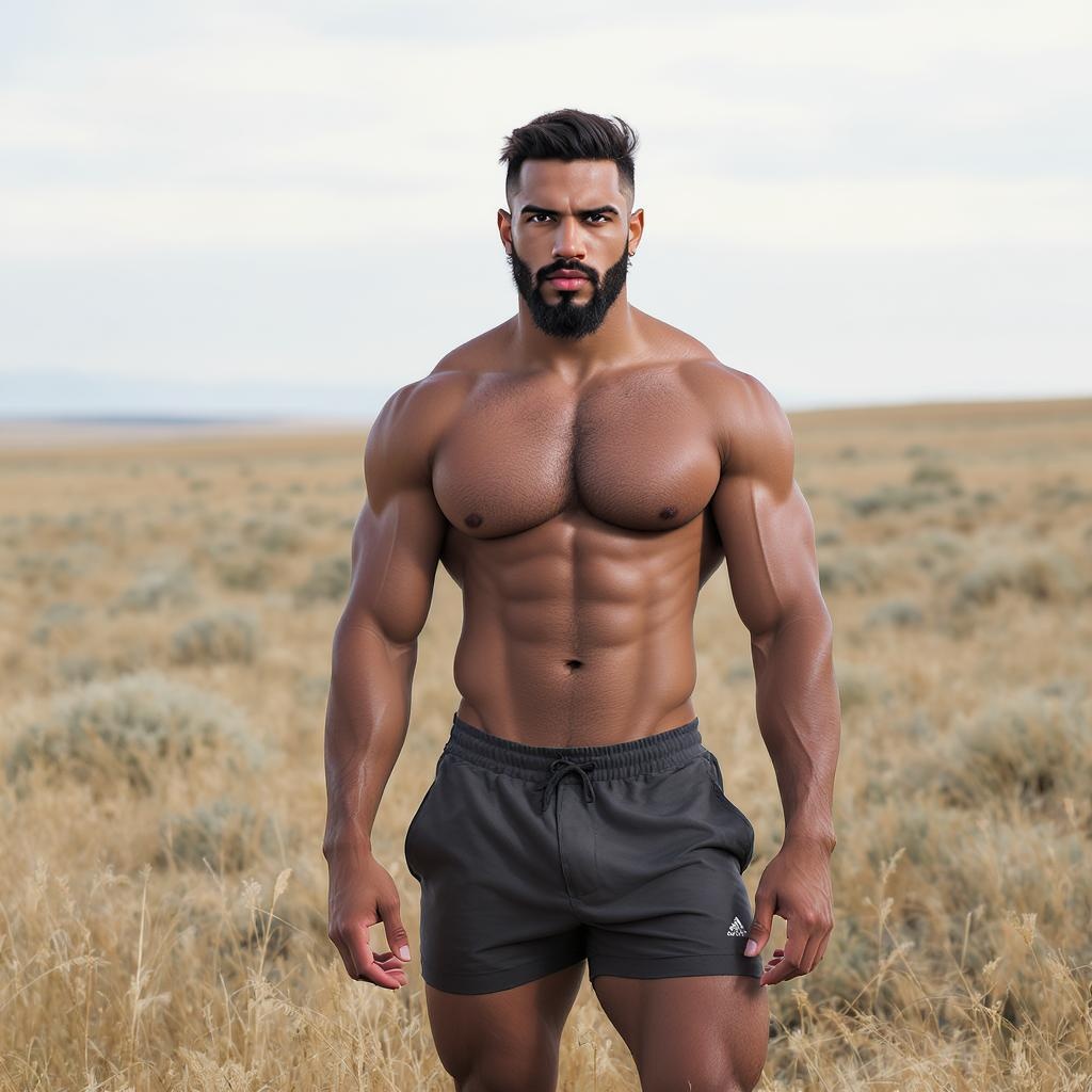 Create a captivating full-length portrait featuring a strikingly athletic and handsome Cuban man. Positioned centrally, he stands confidently, exuding an air of strength and charisma. His tall, muscular physique showcases well-defined abs, a broad, powerful chest covered in natural, rugged chest hair, and prominently strong shoulders. His alluring asymmetrical eyes add a unique charm, while a hint of beard stubble enhances his masculine appeal. His well-toned legs are displayed confidently, conveying both elegance and strength. This photo-realistic depiction captures the essence of award-winning photography, highlighting his athletic form amidst a wide field of view that emphasizes the subject's presence and allure.