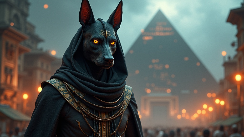 Create an epic hyperrealistic portrait of an Egyptian male Anubis in a cyberpunk setting, featuring intricate detailing and a dark fantasy atmosphere. The character stands against a backdrop of a mystical pyramid, with hyperdetailed eyes and dynamic lighting that enhances the mysterious aura. Inspired by the style of Greg Rutkowski, this 8k resolution concept art captures the essence of an enigmatic and powerful figure in a world blending ancient and futuristic themes. Despite the chaotic and otherworldly environment, ensure that the visuals remain clear and well-composed, focusing on masterful craftsmanship and exceptional detail. Avoid any imperfections like distorted anatomy or unclear compositions, maintaining a high standard of artistry throughout.