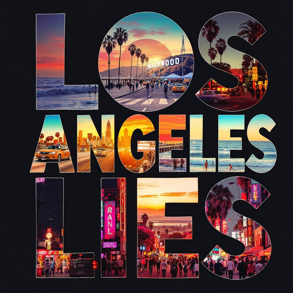 Create a vibrant and dynamic vertical collage capturing the essence of Los Angeles, with each letter of 'Los Angeles' represented by a unique and lively scene. Iconic landmarks such as the Santa Monica Pier and Hollywood Sign serve as the backdrop, while the foreground is filled with bustling street life, yellow cabs, and diverse people engaged in various activities. The energy of the city is palpable, with bold and eye-catching typography weaving through the collage to form a stunning visual representation of LA's vibrant spirit. The artwork should evoke a cinematic feel with high contrast and richness in color, maintaining a strong focus on the lively atmosphere of the city.