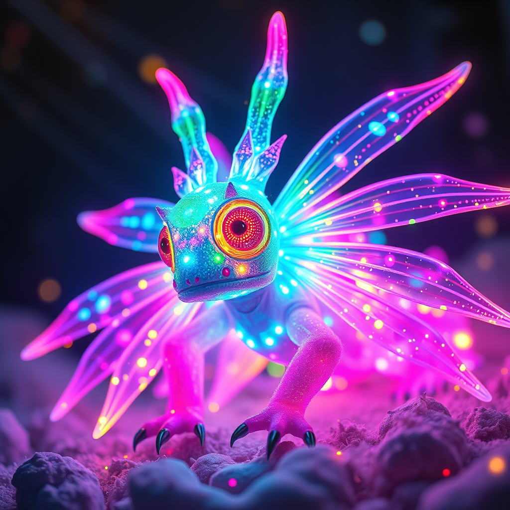 View this AI-generated image featuring a fantastical creature composed of vibrant neon rays intricately detailed with fairy like illumination showcasing photorealistic textures and a spectrum of bright colors immersed in a scene with volumetric light beams and high dynamic range in a captivating and