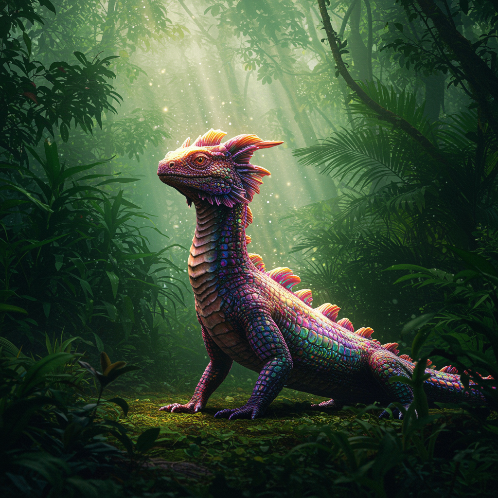 View this AI-generated image featuring a fantastical creature in the heart of the jungle its intricate scales shimmering with vibrant hues as beams of enchanting light dance playfully across its form displaying an extraordinary level of detail the environment is lush and alive saturated with dazzlin