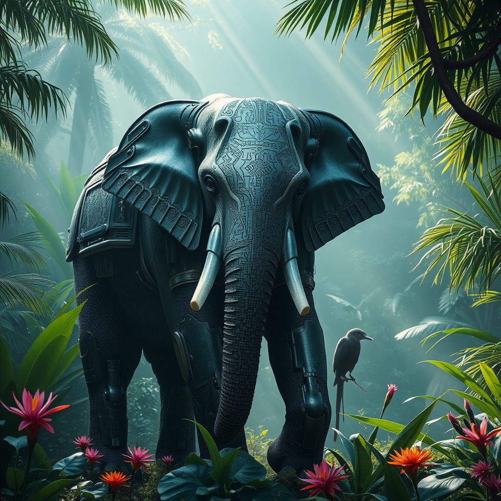 A majestic cybernetic elephant adorned in intricate battle armor, its metallic surfaces gleaming with circuit-like patterns, stands poised against a dense tropical forest backdrop. The play of light and shadow creates a chiaroscuro effect, highlighting the intricate sgraffito-style engravings on the armor, as exotic foliage and vibrant flora surround the formidable creature. Lush greenery and the soft mist of the jungle create an ethereal atmosphere, contrasting with the mechanical marvel in their midst. The scene captures a fusion of nature and technology, embodying the elephant's strength and elegance amidst an otherworldly setting.