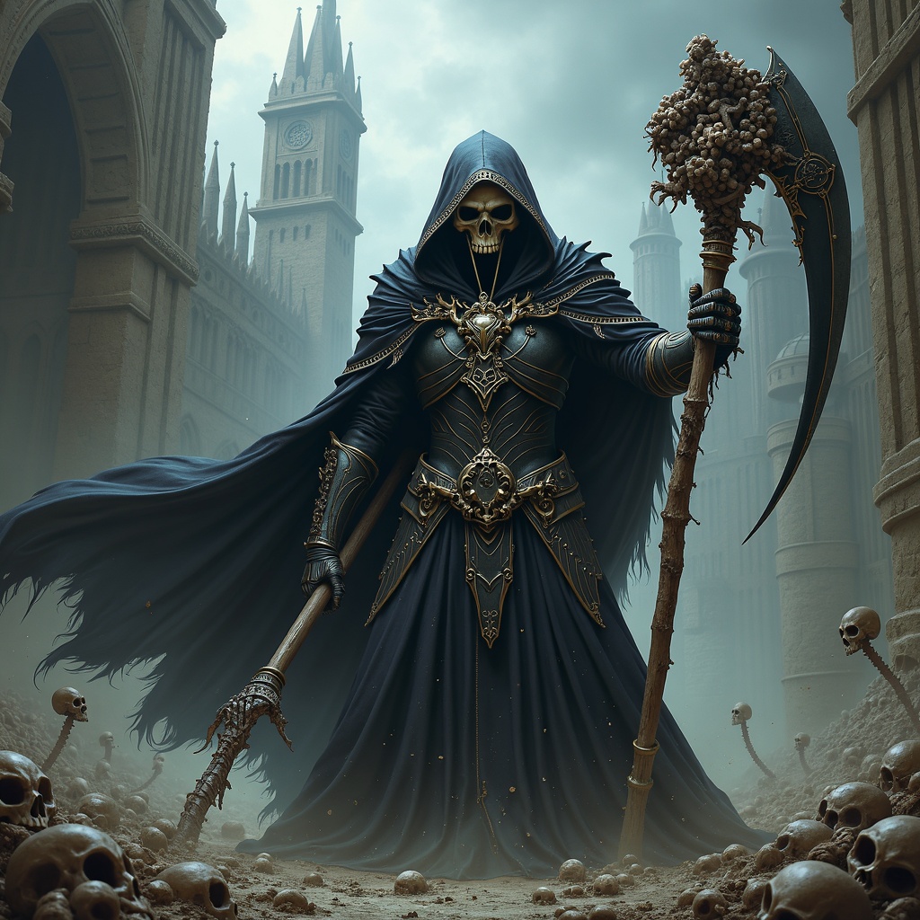 A menacing dark fantasy figure, the grim reaper clad in full plate armor, fiercely wielding an oversized scythe fashioned from bones and skulls, set against the backdrop of an ancient, foreboding city strewn with bones and skeletons. The reaper wears a flowing black hooded cloak adorned with intricate gold trim, its face concealed by a chilling skull mask. The scene vibrates with a gritty, otherworldly atmosphere, the towering skeletal architecture reflecting the battle's chaotic energy under a storm-laden sky.